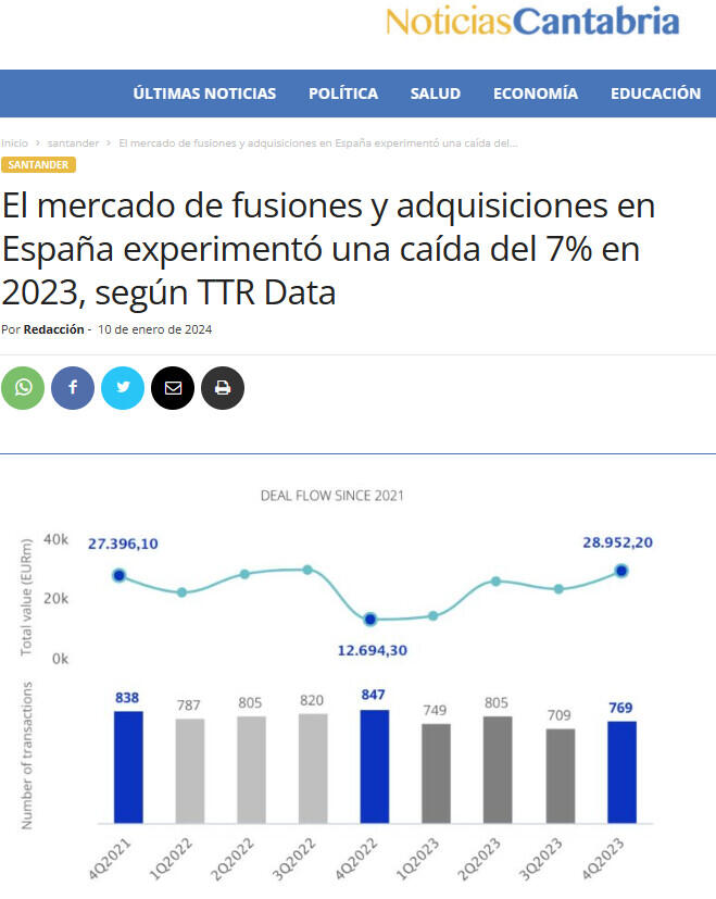 El mercado de fusiones y adquisiciones en España experimentó una caída del 7% en 2023, según TTR Data