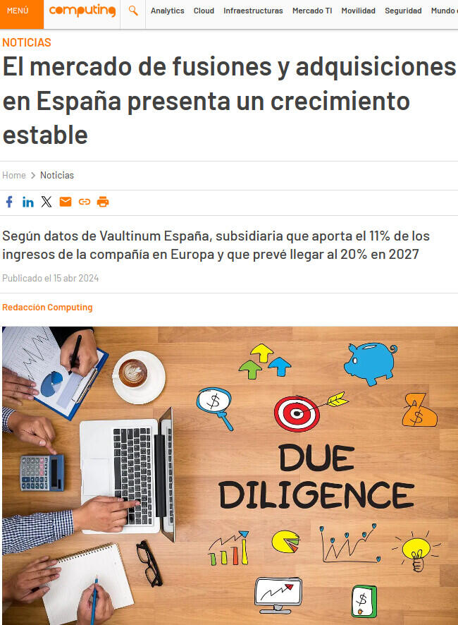 “Somos conscientes de que nuestros planes son muy ambiciosos, pero estamos convencidos de que son alcanzables”, señala Enrique O’Connor, director general de Vaultinum para España y Latam. “Mirando hacia el futuro, mantenemos firme nuestro compromiso de seguir siendo el socio de confianza para empresas e inversores en el mercado español de M&A, ofreciendo soluciones de due diligence tecnológica de vanguardia y contribuyendo al crecimiento y la estabilidad del sector”. Esta evolución está en línea con el ritmo de crecimiento del mercado actual de M&A. Según Iberian Lawyer, en enero de 2024 se registraron 204 operaciones transaccionales, con un valor agregado de 2.366 millones de euros. El informe mensual de TTR Data destaca que el sector inmobiliario lideró el mercado con 37 operaciones, seguido por el sector de Internet, Software y Servicios Informáticos, con 33 transacciones