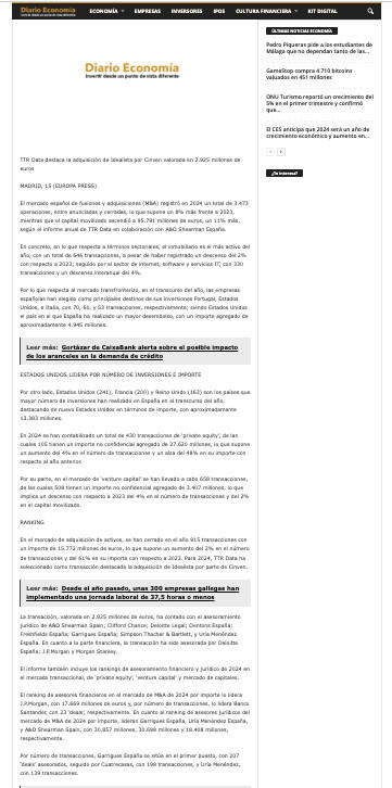 El mercado español de fusiones y adquisiciones (M&A) registró en 2024 un total de 3.473 operaciones, entre anunciadas y cerradas, lo que supone un 8% más frente a 2023, mientras que el capital movilizado ascendió a 95.791 millones de euros, un 11% más, según el informe anual de TTR Data en colaboración con A&O Shearman España.