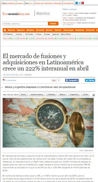 El mercado de fusiones y adquisiciones en Latinoamérica marcó otro mes positivo en abril, en el que el valor de las operaciones se mantuvo en los altos niveles de marzo. En la comparativa interanual, el mercado movió un 222% más, hasta alcanzar los 14,637 millones de dólares en operaciones de valor no confidencial, según revela el último informe de la consultora TTR. El crecimiento acumulado en lo que va de año es de un 124.39% respecto al mismo periodo de 2016.