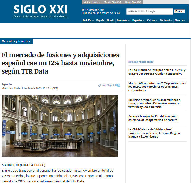 El mercado de fusiones y adquisiciones español cae un 12% hasta noviembre, según TTR Data