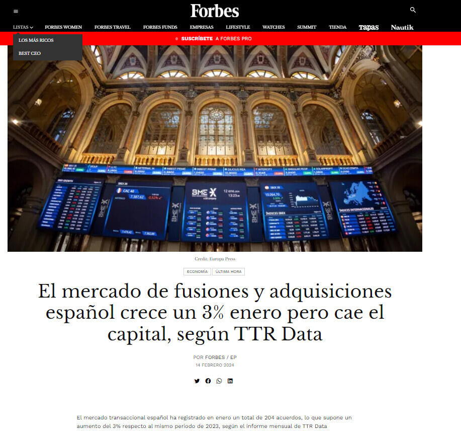 El mercado de fusiones y adquisiciones español crece un 3% enero pero cae el capital, según TTR Data