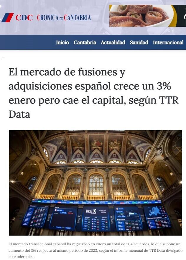 El mercado transaccional español ha registrado en enero un total de 204 acuerdos, lo que supone un aumento del 3% respecto al mismo periodo de 2023, según el informe mensual de TTR Data divulgado este miércoles.