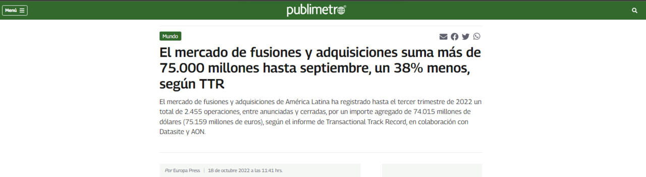 El mercado de fusiones y adquisiciones de América Latina ha registrado hasta el tercer trimestre de 2022 un total de 2.455 operaciones, entre anunciadas y cerradas, por un importe agregado de 74.015 millones de dólares (75.159 millones de euros), según el informe de Transactional Track Record, en colaboración con Datasite y AON.