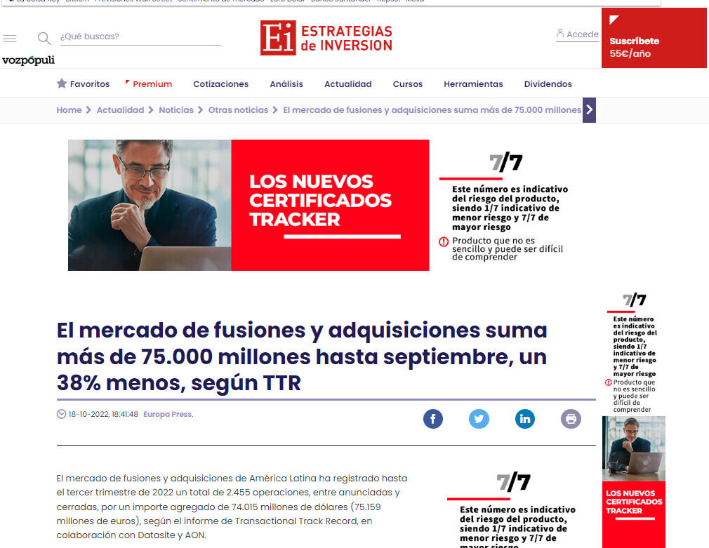 Estas cifran suponen una disminución del 10% en el número de transacciones y una disminución del 38% en su valor con respecto a las cifras registradas en el tercer trimestre de 2021.
