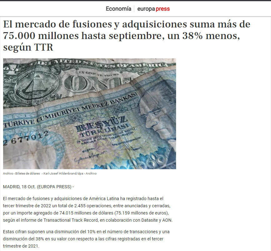 El mercado de fusiones y adquisiciones de América Latina ha registrado hasta el tercer trimestre de 2022 un total de 2.455 operaciones, entre anunciadas y cerradas, por un importe agregado de 74.015 millones de dólares (75.159 millones de euros), según el informe de Transactional Track Record, en colaboración con Datasite y AON.