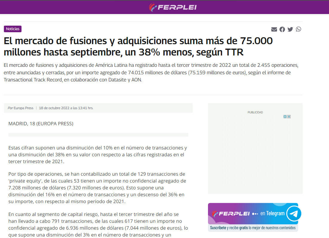 El mercado de fusiones y adquisiciones de América Latina ha registrado hasta el tercer trimestre de 2022 un total de 2.455 operaciones, entre anunciadas y cerradas, por un importe agregado de 74.015 millones de dólares (75.159 millones de euros), según el informe de Transactional Track Record, en colaboración con Datasite y AON.