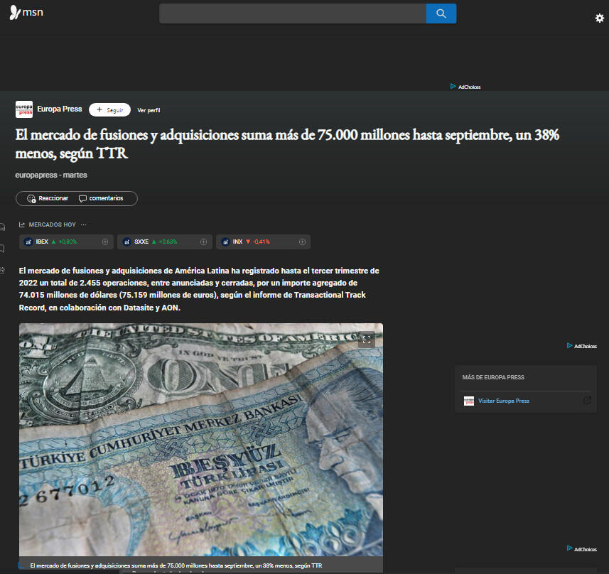 El mercado de fusiones y adquisiciones de América Latina ha registrado hasta el tercer trimestre de 2022 un total de 2.455 operaciones, entre anunciadas y cerradas, por un importe agregado de 74.015 millones de dólares (75.159 millones de euros), según el informe de Transactional Track Record, en colaboración con Datasite y AON.