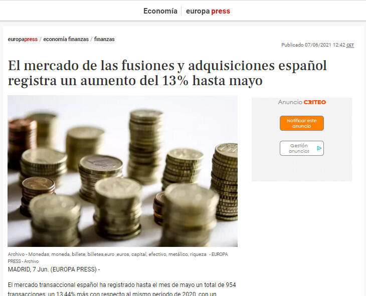 El mercado de las fusiones y adquisiciones espaņol registra un aumento del 13% hasta mayo
