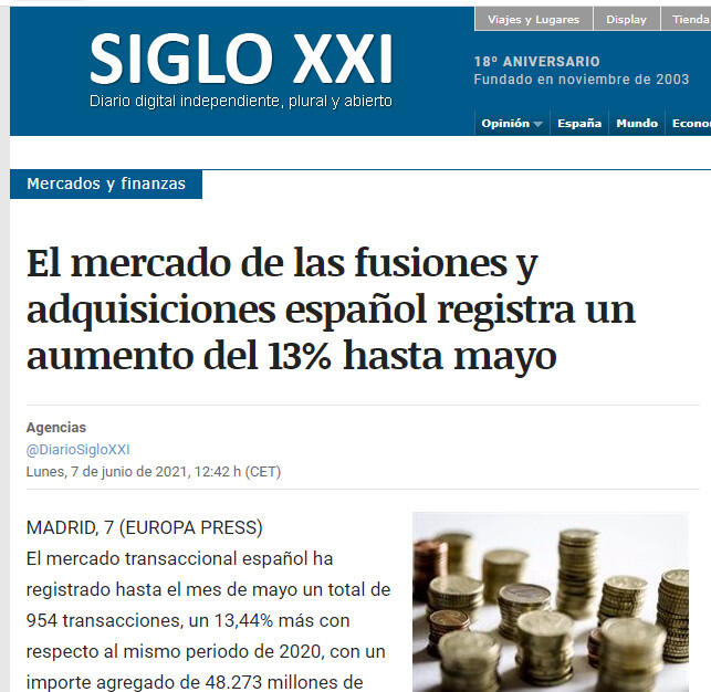 El mercado de las fusiones y adquisiciones espaņol registra un aumento del 13% hasta mayo