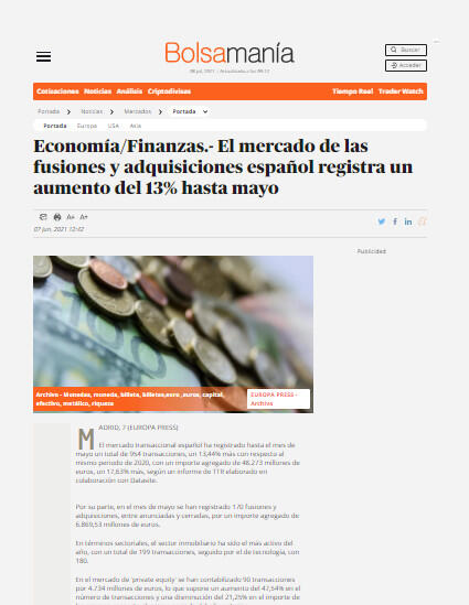 El mercado de las fusiones y adquisiciones espaņol registra un aumento del 13% hasta mayo