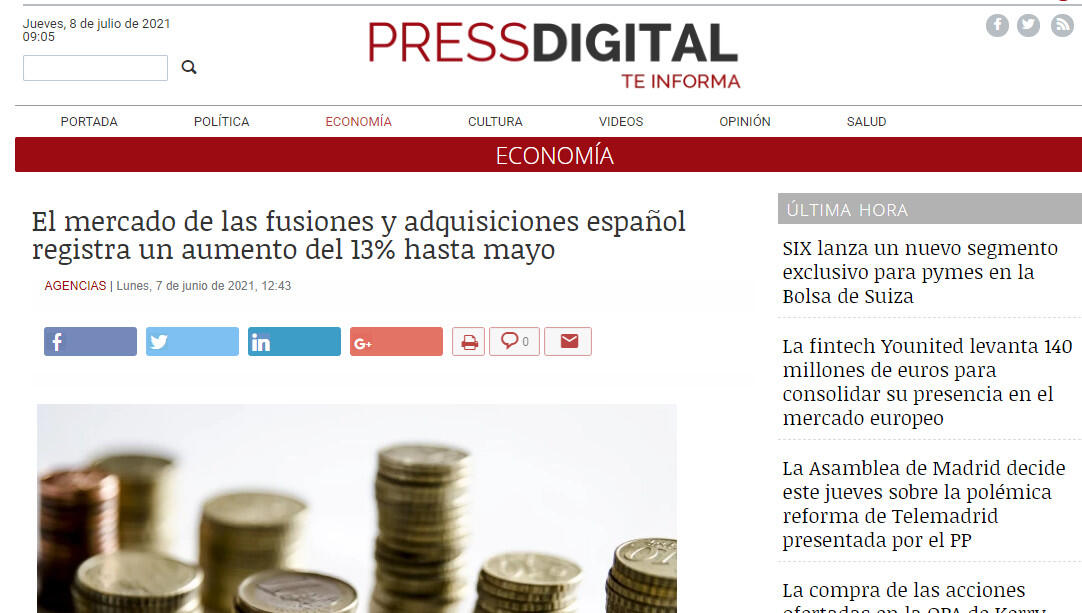 El mercado de las fusiones y adquisiciones espaņol registra un aumento del 13% hasta mayo