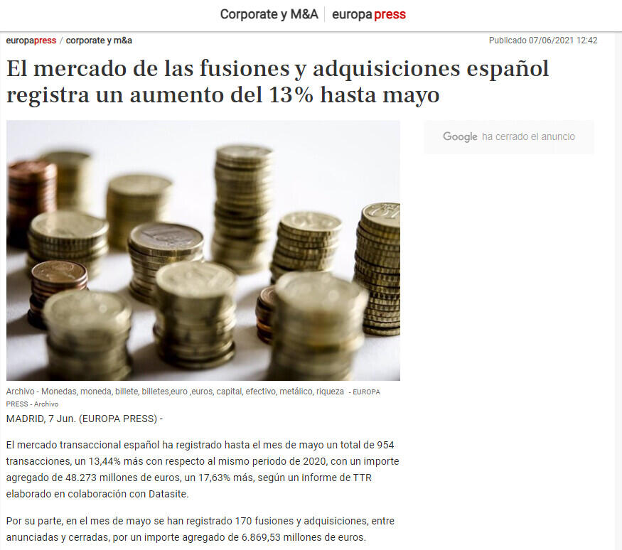 El mercado transaccional español ha registrado hasta el mes de mayo un total de 954 transacciones, un 13,44% más con respecto al mismo periodo de 2020, con un importe agregado de 48.273 millones de euros, un 17,63% más, según un informe de TTR elaborado en colaboración con Datasite.