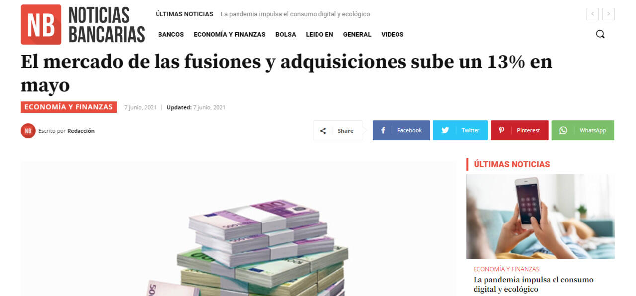 Por su parte, en el mes de mayo se han registrado 170 fusiones y adquisiciones, entre anunciadas y cerradas, por un importe agregado de 6.869,53 millones de euros.