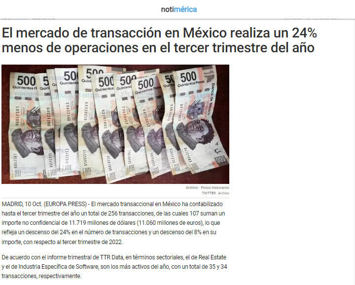 El mercado transaccional en México ha contabilizado hasta el tercer trimestre del año un total de 256 transacciones, de las cuales 107 suman un importe no confidencial de 11.719 millones de dólares (11.060 millones de euros), lo que refleja un descenso del 24% en el número de transacciones y un descenso del 8% en su importe, con respecto al tercer trimestre de 2022.