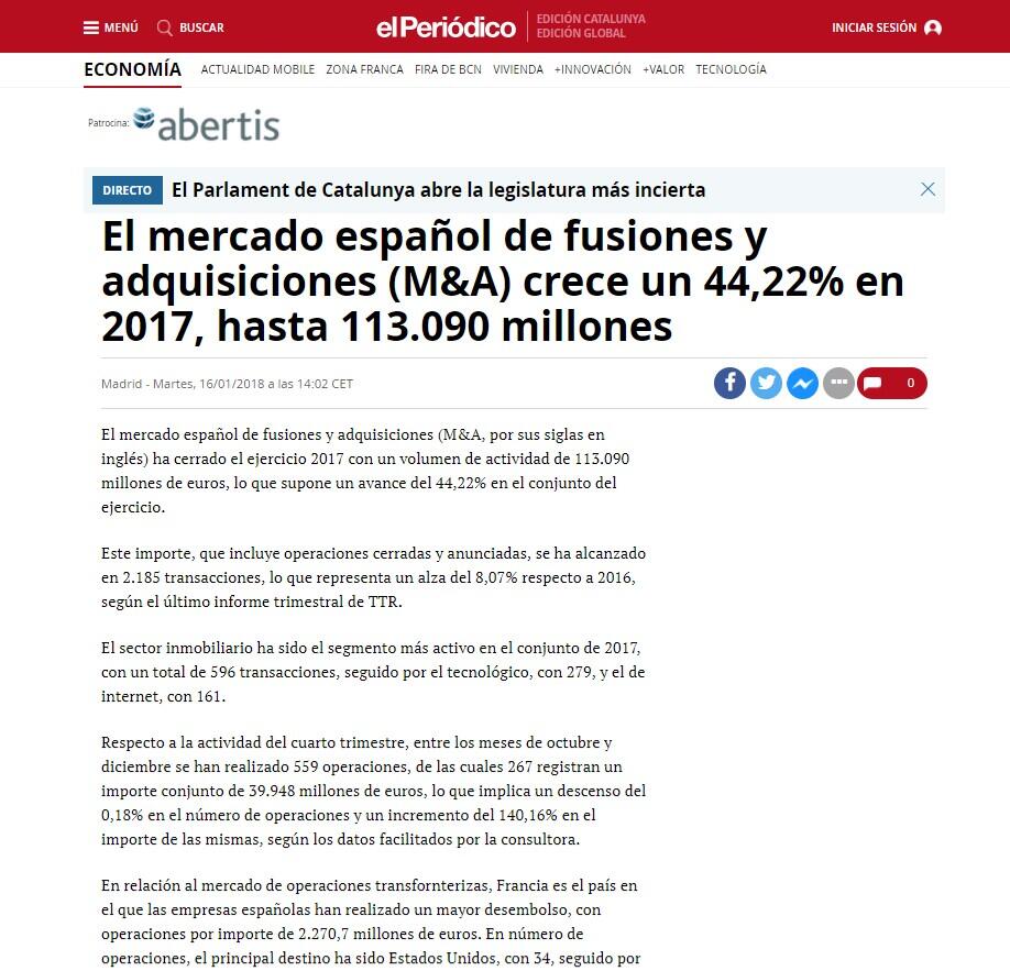El mercado español de fusiones y adquisiciones (M&A, por sus siglas en inglés) ha cerrado el ejercicio 2017 con un volumen de actividad de 113.090 millones de euros, lo que supone un avance del 44,22% en el conjunto del ejercicio.
