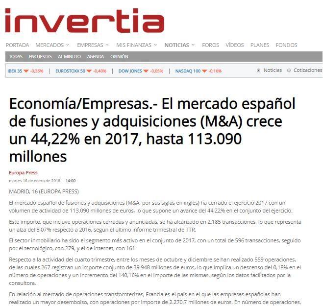 El mercado espaņol de fusiones y adquisiciones (M&A) crece un 44,22% en 2017, hasta 113.090 millones