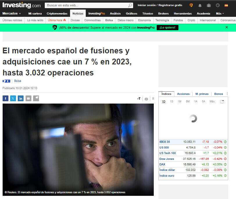El mercado espaņol de fusiones y adquisiciones cae un 7 % en 2023, hasta 3.032 operaciones