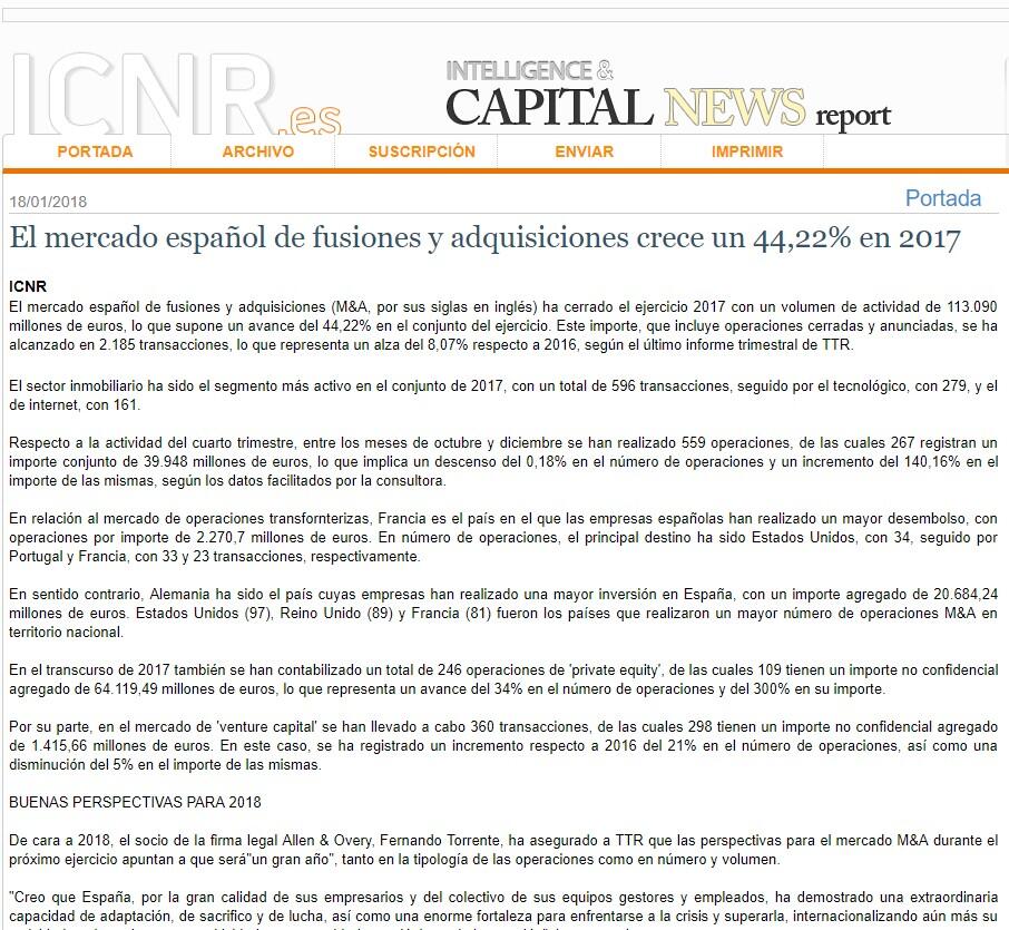De cara a 2018, el socio de la firma legal Allen & Overy, Fernando Torrente, ha asegurado a TTR que las perspectivas para el mercado M&A durante el próximo ejercicio apuntan a que será"un gran año", tanto en la tipología de las operaciones como en número y volumen.