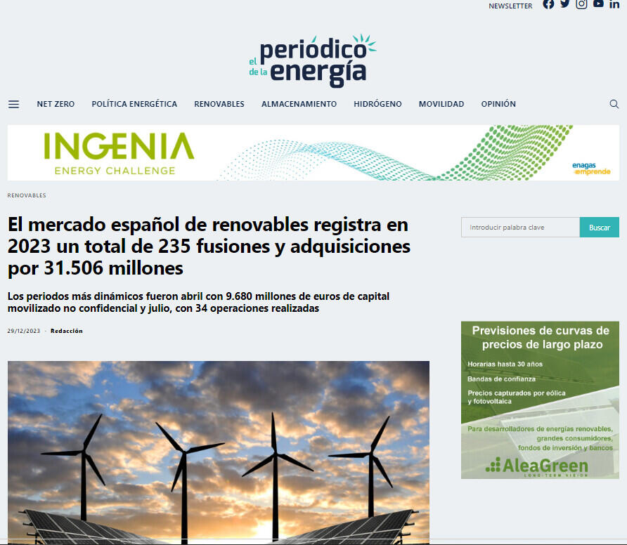 El mercado español de renovables registra en 2023 un total de 235 fusiones y adquisiciones por 31.506 millones