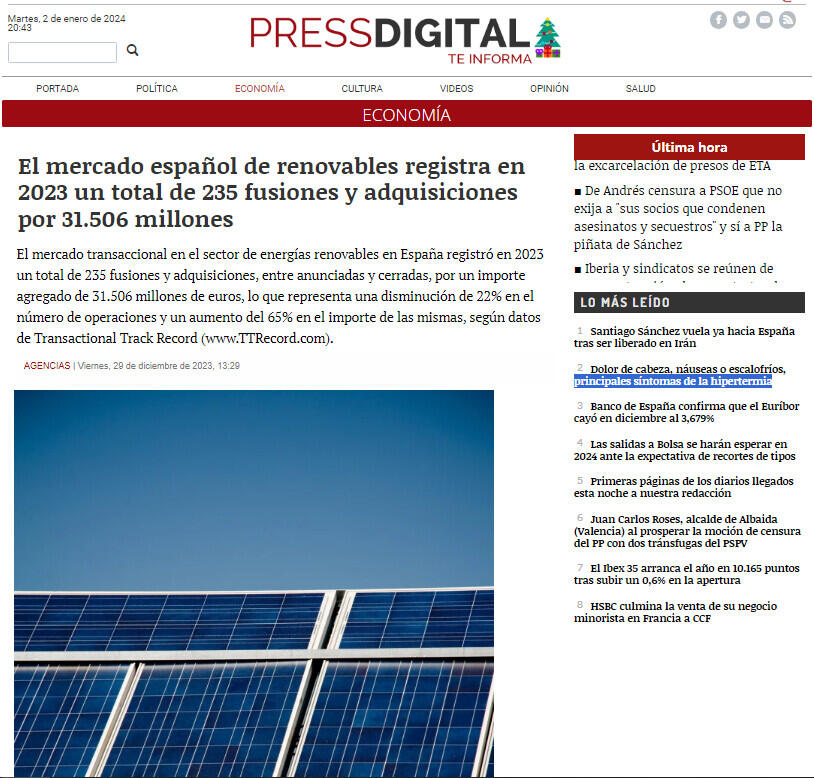En cuanto a subsectores más activos, el de energía solar y energía eólica fueron los más activos de 2023, con 136 y 52 'deals', respectivamente.