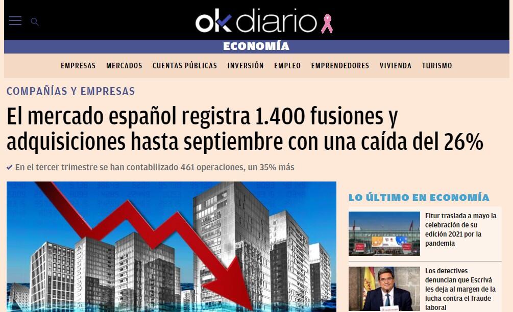 El mercado transaccional español ha registrado 1.387 operaciones hasta el mes de septiembre, lo que supone un descenso del 26% respecto al mismo periodo del año anterior, con un importe agregado de 66.043 millones de euros, un 15% más por los efectos de la crisis del coronavirus.