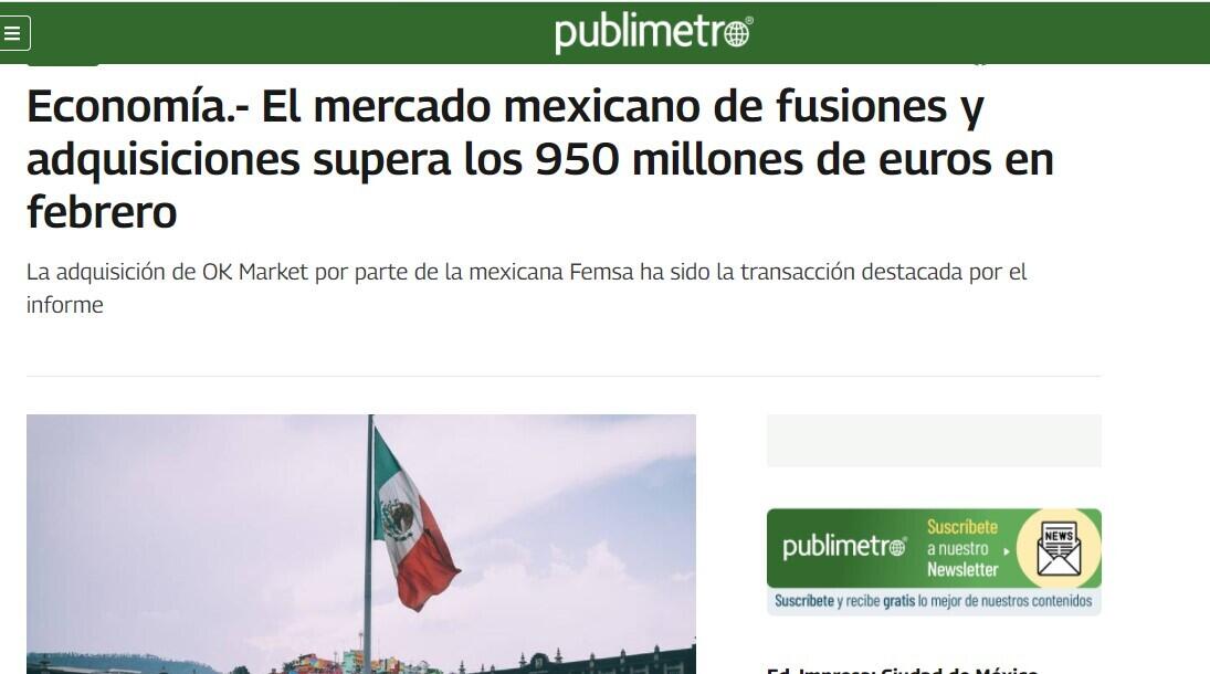 La adquisición de OK Market por parte de la mexicana Femsa ha sido la transacción destacada por el informe. La operación, valorada en 54,53 millones de dólares (49,4 millones de euros), ha sido asesorada legalmente por Morales & Besa Abogados.