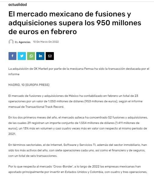 En los dos primeros meses del año, el mercado azteca ha concentrado 52 fusiones y adquisiciones, de las cuales 29 registran un importe conjunto de 1.554 millones de dólares (1.411 millones de euros), un 13% más en volumen y casi cuatro veces más en valor con respecto al mismo periodo de 2021.