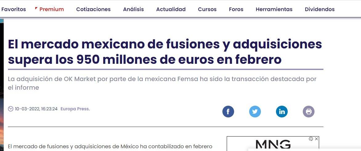 El mercado mexicano de fusiones y adquisiciones supera los 950 millones de euros en febrero