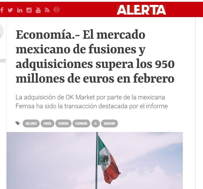 La adquisición de OK Market por parte de la mexicana Femsa ha sido la transacción destacada por el informe. La operación, valorada en 54,53 millones de dólares (49,4 millones de euros), ha sido asesorada legalmente por Morales & Besa Abogados.
