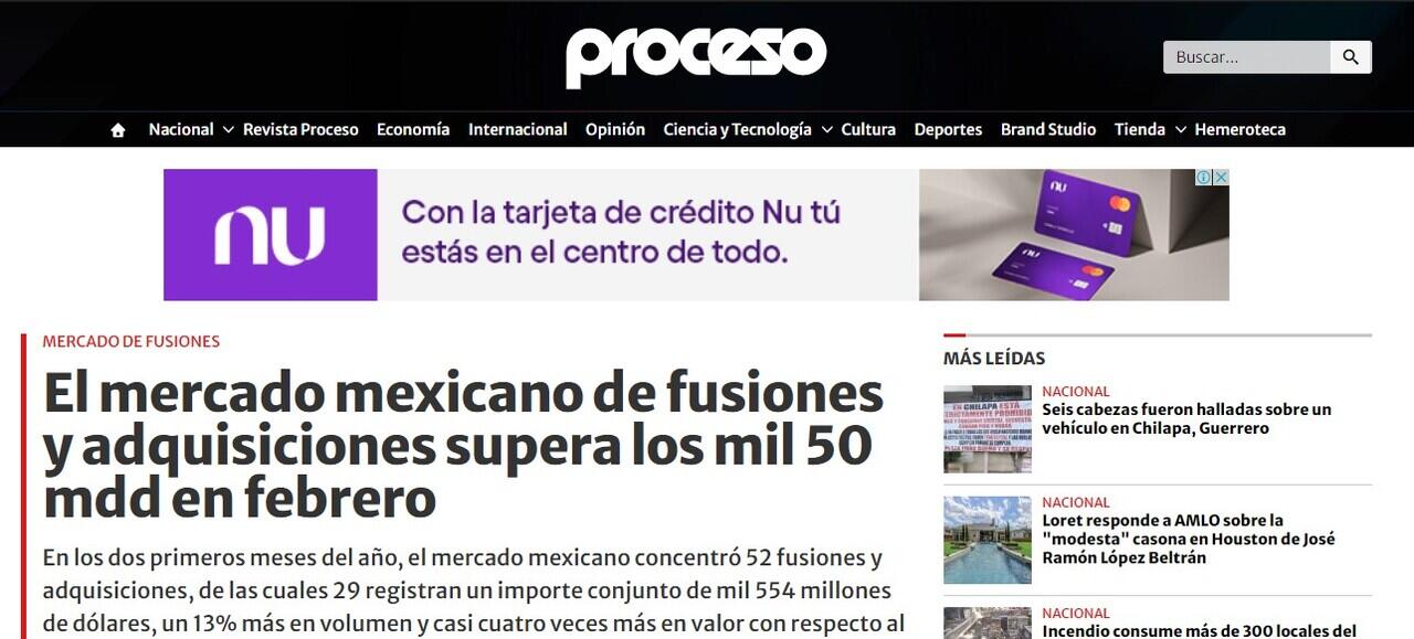 El mercado mexicano de fusiones y adquisiciones supera los mil 50 mdd en febrero
