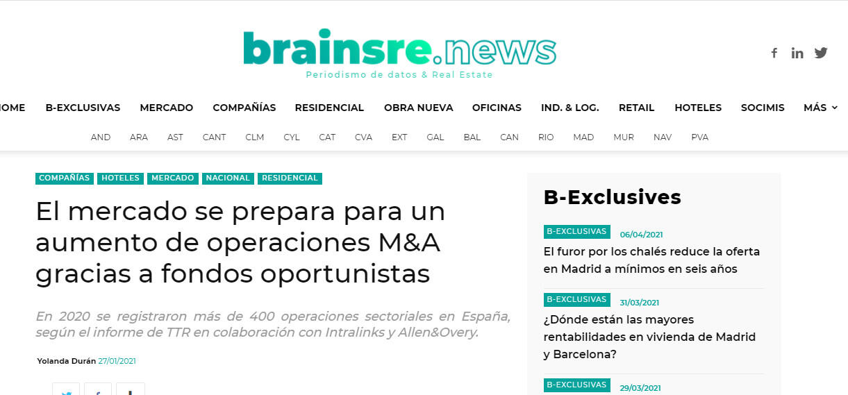 En 2020 se registraron más de 400 operaciones sectoriales en España, según el informe de TTR en colaboración con Intralinks y Allen&Overy.