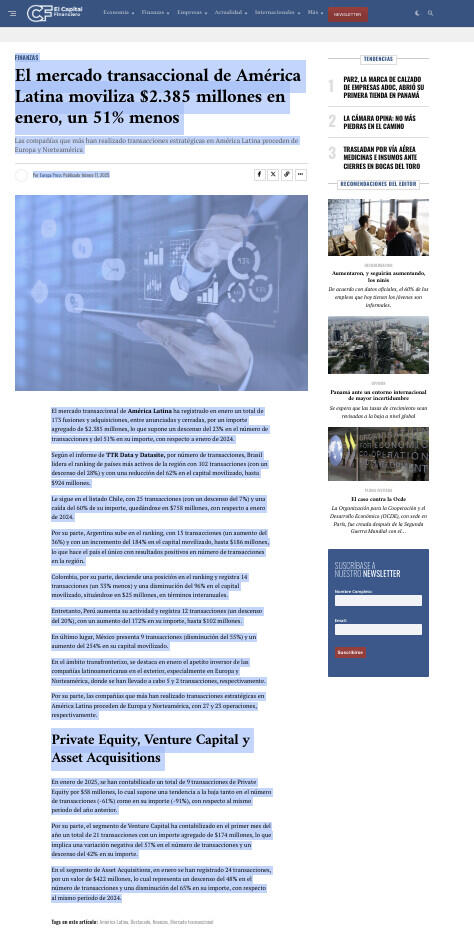 El mercado transaccional de América Latina moviliza $2.385 millones en enero, un 51% menos