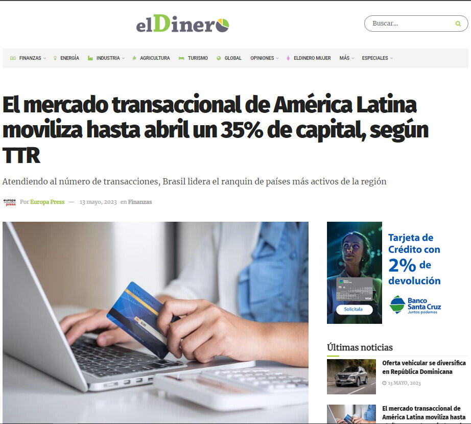 El mercado transaccional de América Latina moviliza hasta abril un 35% de capital, según TTR