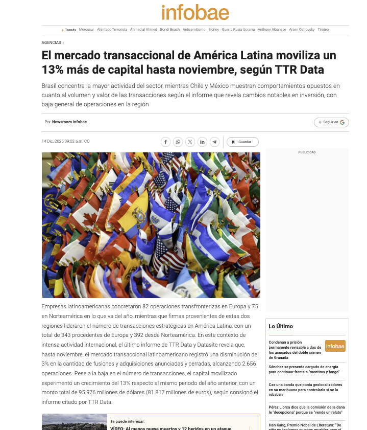 Empresas latinoamericanas concretaron 82 operaciones transfronterizas en Europa y 75 en Norteamérica en lo que va del año, mientras que firmas provenientes de estas dos regiones lideraron el número de transacciones estratégicas en América Latina, con un total de 343 procedentes de Europa y 392 desde Norteamérica. En este contexto de intensa actividad internacional, el último informe de TTR Data y Datasite revela que, hasta noviembre, el mercado transaccional latinoamericano registró una disminución del 3% en la cantidad de fusiones y adquisiciones anunciadas y cerradas, alcanzando 2.656 operaciones. Pese a la baja en el número de transacciones, el capital movilizado experimentó un crecimiento del 13% respecto al mismo periodo del año anterior, con un monto total de 95.976 millones de dólares (81.817 millones de euros), según consignó el informe citado por TTR Data.