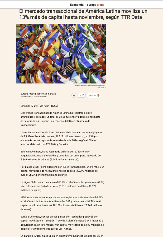 El mercado transaccional de América Latina moviliza un 13% más de capital hasta noviembre, según TTR Data