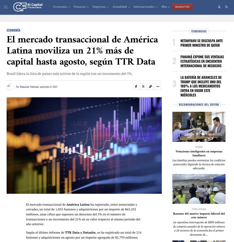 El mercado transaccional de América Latina moviliza un 21% más de capital hasta agosto, según TTR Data