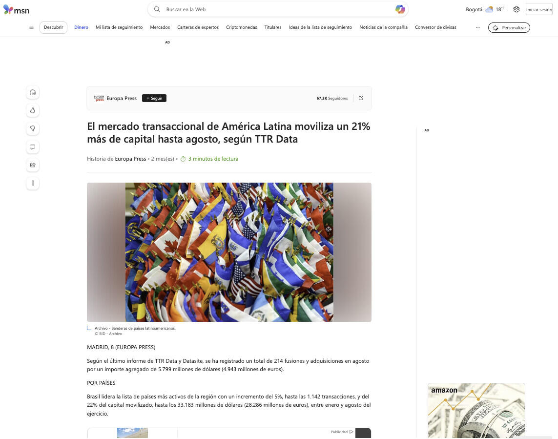 El mercado transaccional de América Latina moviliza un 21% más de capital hasta agosto, según TTR Data
