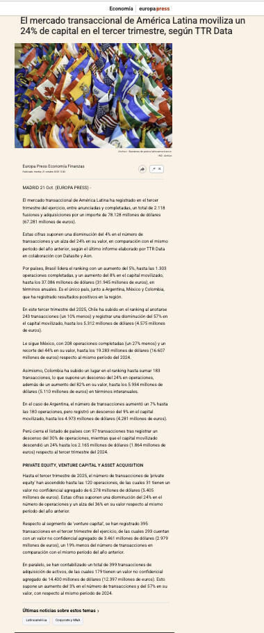 El mercado transaccional de América Latina moviliza un 24% de capital en el tercer trimestre, según TTR Data
