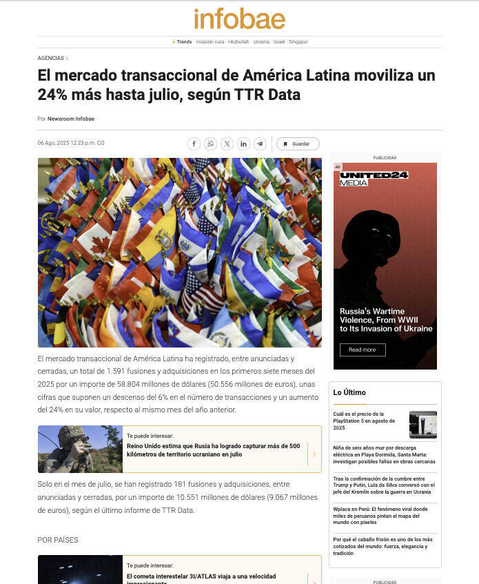 El mercado transaccional de América Latina moviliza un 24% más hasta julio, según TTR Data