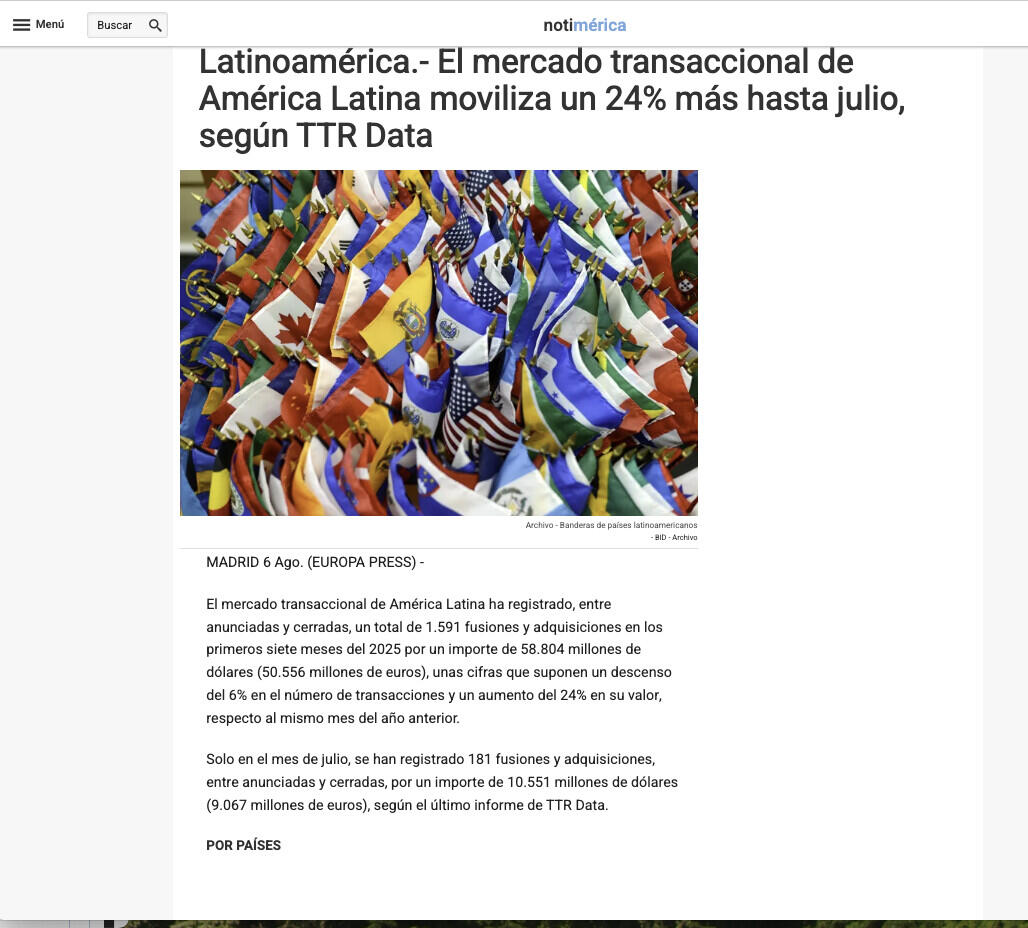 El mercado transaccional de América Latina moviliza un 24% más hasta julio, según TTR Data