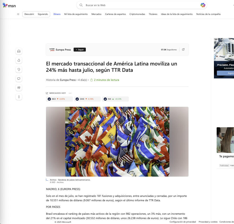 El mercado transaccional de América Latina moviliza un 24% más hasta julio, según TTR Data