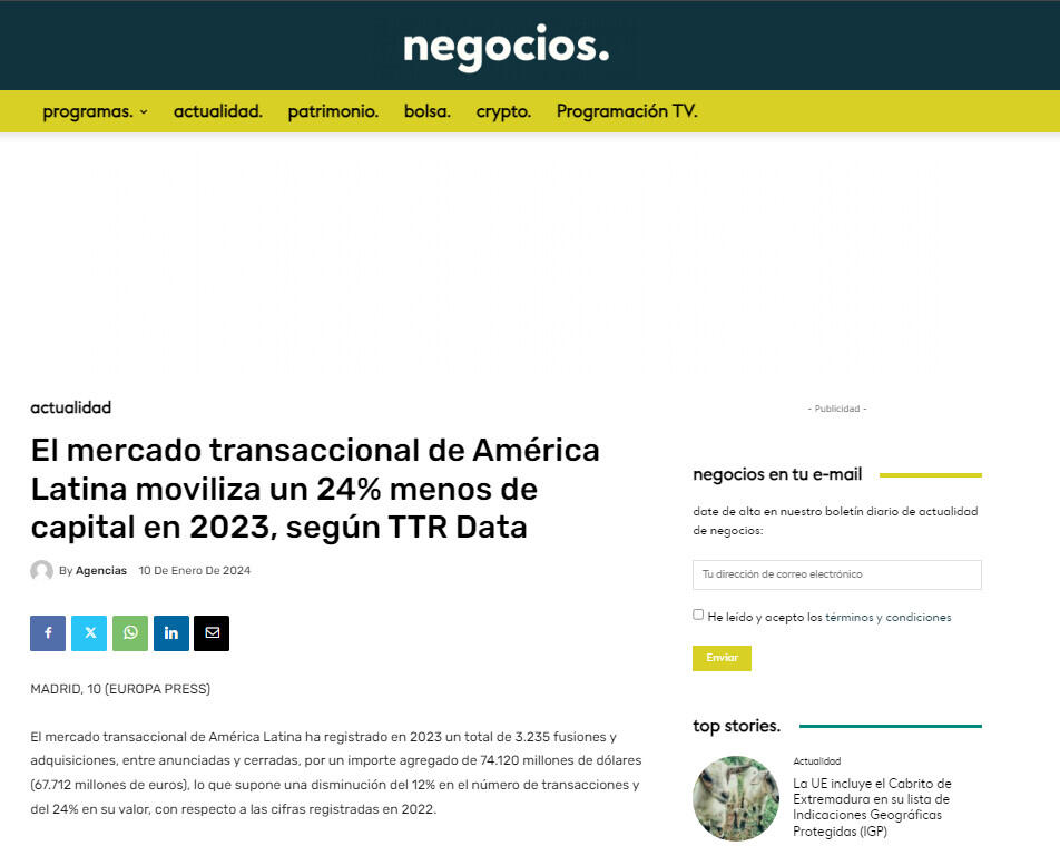 El mercado transaccional de América Latina moviliza un 24% menos de capital en 2023, según TTR Data