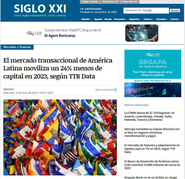 El mercado transaccional de América Latina moviliza un 24% menos de capital en 2023, según TTR Data