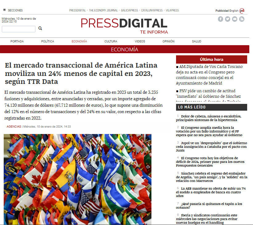El mercado transaccional de América Latina moviliza un 24% menos de capital en 2023, según TTR Data