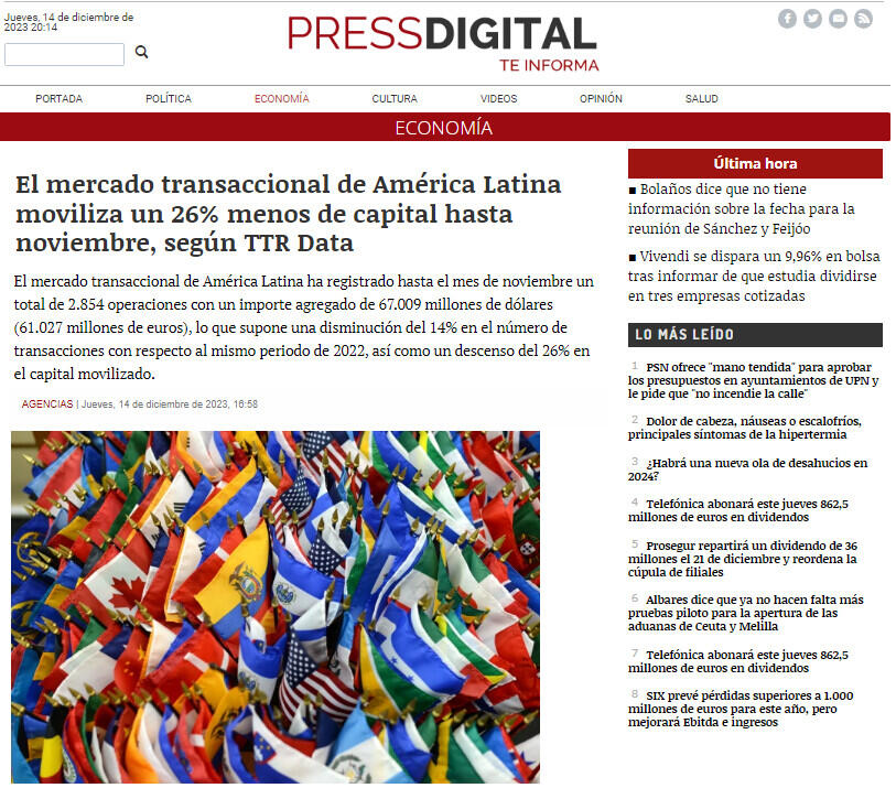 El mercado transaccional de América Latina moviliza un 26% menos de capital hasta noviembre, según TTR Data