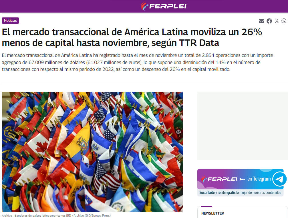 El mercado transaccional de América Latina moviliza un 26% menos de capital hasta noviembre, según TTR Data