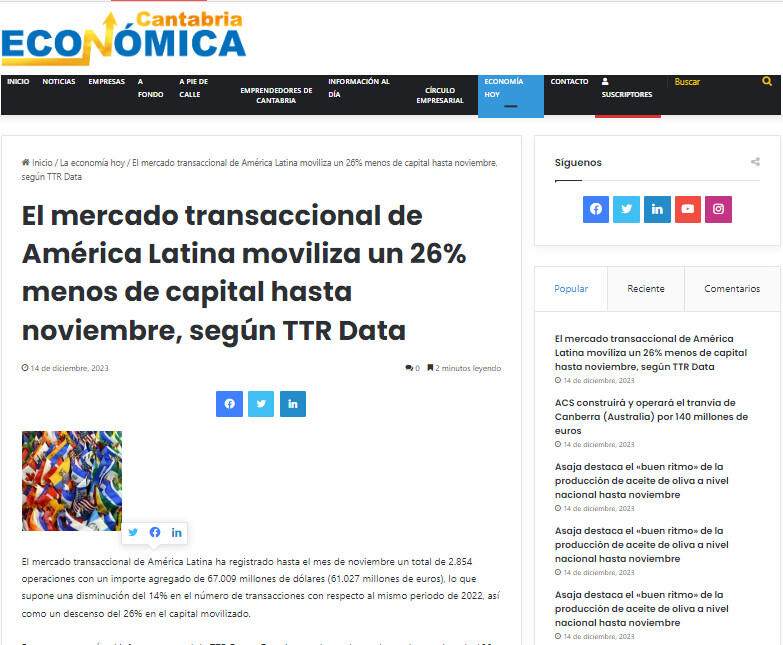 El mercado transaccional de América Latina moviliza un 26% menos de capital hasta noviembre, según TTR Data