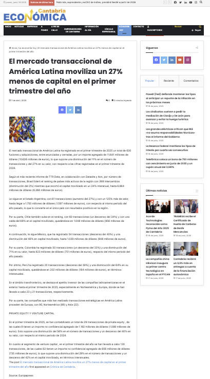 The post El mercado transaccional de América Latina moviliza un 27% menos de capital en el primer trimestre del año first appeared on Crónica de Cantabria.