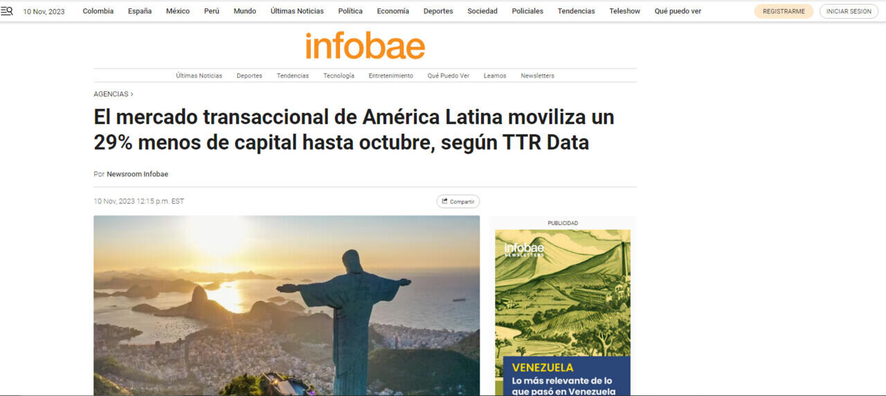 El mercado transaccional de América Latina moviliza un 29% menos de capital hasta octubre, según TTR Data